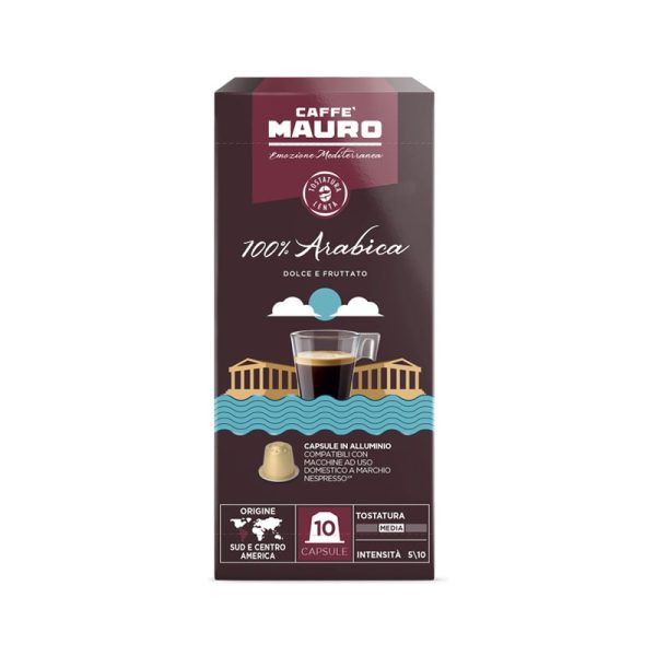 Οι Caffe Mauro 100% Arabica Nespresso κάψουλες αλουμινίου περιέχουν ένα μείγμα καφέ Arabica Κεντρικής και Νότιας Αμερικής. Αυτό το μείγμα χαρακτηρίζεται από μια όμορφη γλυκύτητα στον ουρανίσκο, που ενισχύεται από ένα μέτριο καβούρδισμα. Η ένταση αυτού του καφέ είναι μέτρια με βαθμολογία 5/10. Είναι ο ιδανικός καφές για όσους αγαπούν τους εσπρέσο που δεν είναι υπερβολικά δυνατοί. Έχει αρκετή γλυκύτητα και διατηρεί τον χαρακτήρα των ποικιλιών από τις οποίες παρασκευάζεται. Χαρακτηρίζεται γλυκός και φρουτώδης στη γεύση.