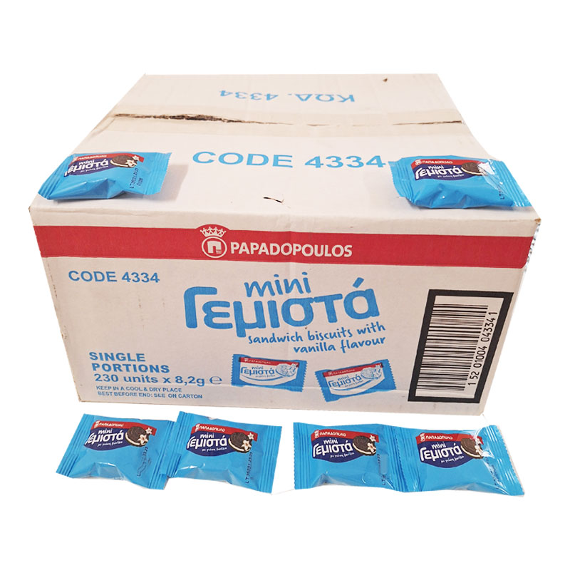 Μπισκότα Παπαδοπούλου Γεμιστά βανίλια ατομικά με βάρος 8,2g ανά τεμάχιο και 230 τεμάχια στο σύνολο.