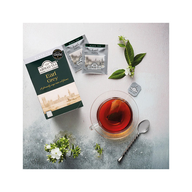 Το Ahmad Tea EARL GREY BLACK TEA είναι ένα μαύρο τσάι με φλούδες περγαμόντου. Ένα εκλεπτυσμένο ρόφημα τσαγιού που θα ικανοποιήσει και τον πιο απαιτητικό λάτρη τσαγιού. Καταπραϋντικό και ταυτόχρονα αναζωογονητικό. Αποτελεί ένα από τα τσάγια που κερδίζουν υψηλή βαθμολογία στην προτίμηση των καταναλωτών. Αυτό το μίγμα έχει φτιαχτεί από μαύρα τσάγια της Ανατολικής Αφρικής και Ινδίας. Έχει χρησιμοποιηθεί υψηλή αναλογία ποιοτικών φύλλων Κένυας για να δώσουν στο ρόφημα τη ζωηρή, έντονη γεύση του. Στη συνέχεια έχει προστεθεί το αποκλειστικό φυσικό άρωμα περγαμόντο για να ενισχύσει το τσάι με το εξωτικό άρωμα εσπεριδοειδών.